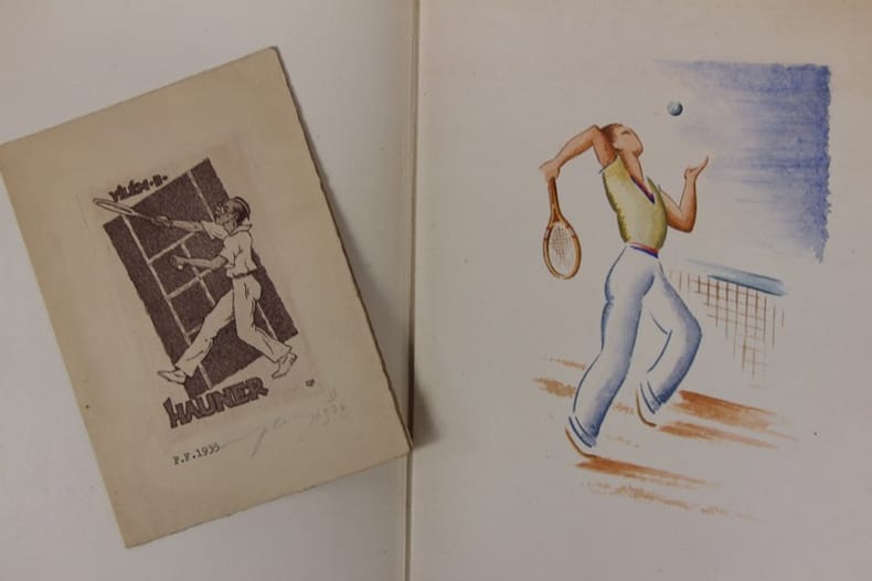 [Pargue, 1935] 1935 In-4, demi-basane cerise à bande, dos lisse muet, pièce de titre orné au premier plat de chagin fauve et grenat ; une illustration tennistique, la dédicace et le diplome 4 ff., le tout lithographié en couleurs, en feuille sous cordelette, signé par le président et le secrétaire -général du club Vilém B. Hauner. On joint une correspondance nécrologique 1982 et une gravure de 1934 signée artiste non identifié figurant Hauner au tennis. Reliure ternie, manque important au dos.