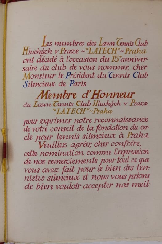 Exemplaire unique. Vilém Bohumír Hauner (1903-1982), devenu sourd dans sa jeunesse par suite d’une méningite, étudie la reliure d'art à l'École graphique d'État à Prague. Après ses études, il travaille pendant deux ans à Paris, où il devient sociétaire du Salon International des Artistes Sourds et ouvre son propre atelier. Grâce aux programmes scolaires pour les sourds élaborés par sa mère, Vilém Hauner est rapidement devenu célèbre et de luxueuses reliures lui sont commandées. Hauner est aussi connu pour ses gravures et ses dorures. Le Tennis Club Silencieux de Paris (TCSP),à été fondé en 1930 puis rebaptisé Tennis Club des Sourds de Paris (TCSP) en 1975. Bon état d’occasion