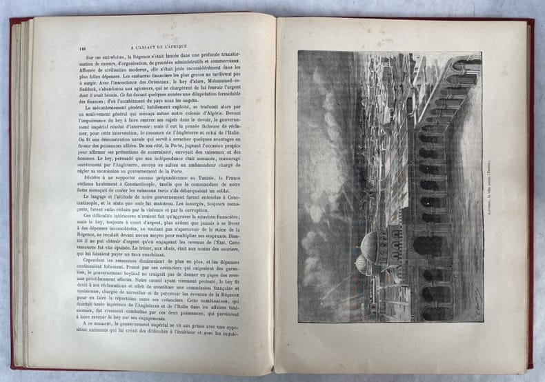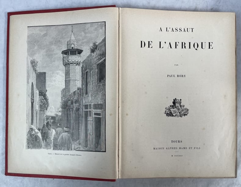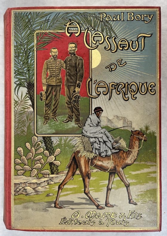 Tours, Mame, 1901.In-4, percaline rouge illustrée, estampée et dorée de Paul Souse, 398 pp., nombreuses illustrations, plans et photos in-t. L'histoire de la découverte du Soudan Français et l'occupation de l'Afrique par les puissances occidentales.
