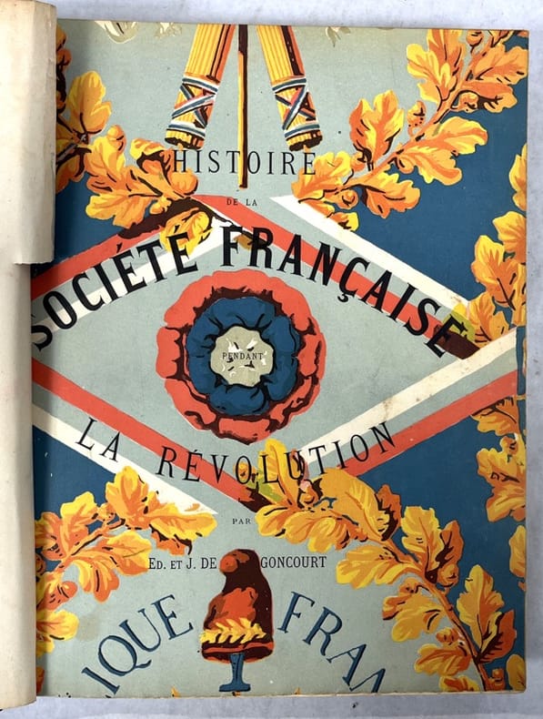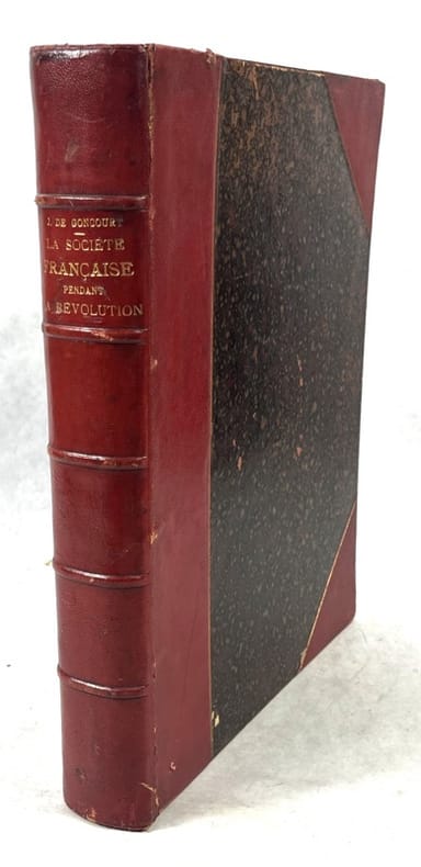 Paris Dentu 1854 1 vol. Relié gr. in-8, demi-chagrin vert, dos à nerfs, caissons ornés d'un filet à froid en encadrement, tranches mouchetées, (4)-480 pp.Édition originale publiée à compte d'auteur à 1 000 exemplaires (plus 3 Hollande hors commerce), les 500 derniers mis en vente avec la mention de deuxième édition comme celui-ci. Annoncée le 1er avril 1854, imprimée par Mme Dondey-Dupré et vendue 5 francs, l'Histoire de la société française pendant la Révolution comprend une préface du 31 janvier 1854, où les Goncourt avouent qu'ils ont "consulté environ 15 000 documents contemporains : journaux, livres, brochures, etc." Leur méthode consiste à compiler une infinité de détails et de rites oubliés pour restituer l'esprit d'une époque, à travers ses moeurs et ses coutumes.Bon exemplaire en reliure d'époque (mors et nerfs frottés) comprenant, à la suite, l'édition originale de L'Histoire de la société française pendant le Directoire, éditée par Dentu et imprimée par la même, à 1 000 exemplaires de 444 pp. dont 2 de table, avec 3 pp. de préface datée du 31 janvier 1855. Les Goncourt y citent leurs devanciers, "leurs maîtres", "deux anecdotiers", Plutarque et Saint-Simon. Détail amusant : ils parlent de "la petite histoire", notion qui fit florès au XXe siècle pour G. Lenôtre. L'originale est sortie le 24 mars 1855, comme en témoigne le Journal des frères à cette date. Ex-libris manuscrit Alain Barbier Sainte Marie.