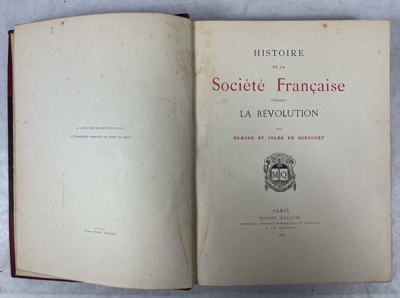 Ce n'est que dans l'édition de 1889 illustrée de Quantin qu'une toute petite partie des documents rassemblés fut proposée au lecteur, avec des documents nouveaux, trouvés par Edmond seul. Le pavé de Quantin, Histoire de la société française pendant la Révolution, entrait dans la catégorie des livres d'étrennes, les dates le prouvent : il est mis en librairie le 8 décembre 1888;exemplaire defraichi avec. mouillures angulaires sur tout le volume dans les grandes marges (rognables), dans l’etat Remise de 20% pour toutes commandes égales ou supérieures à 200 €