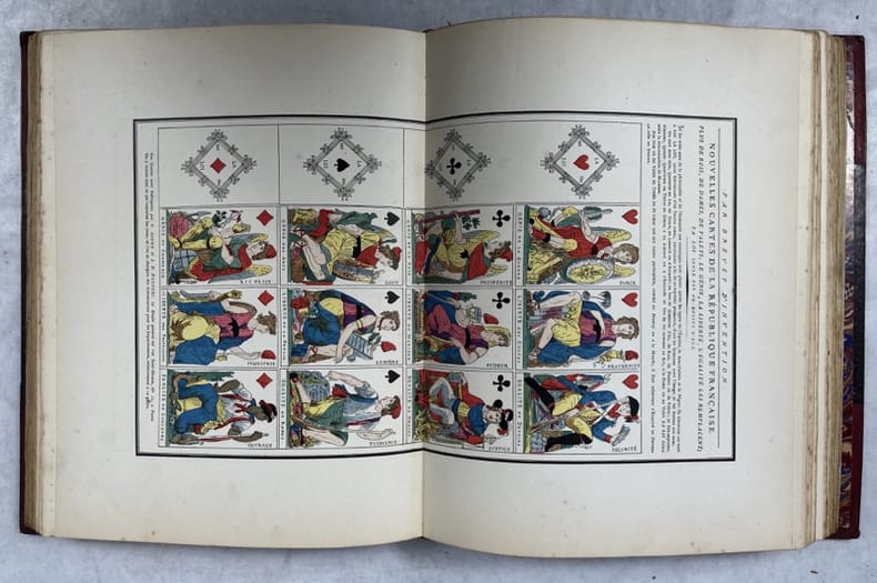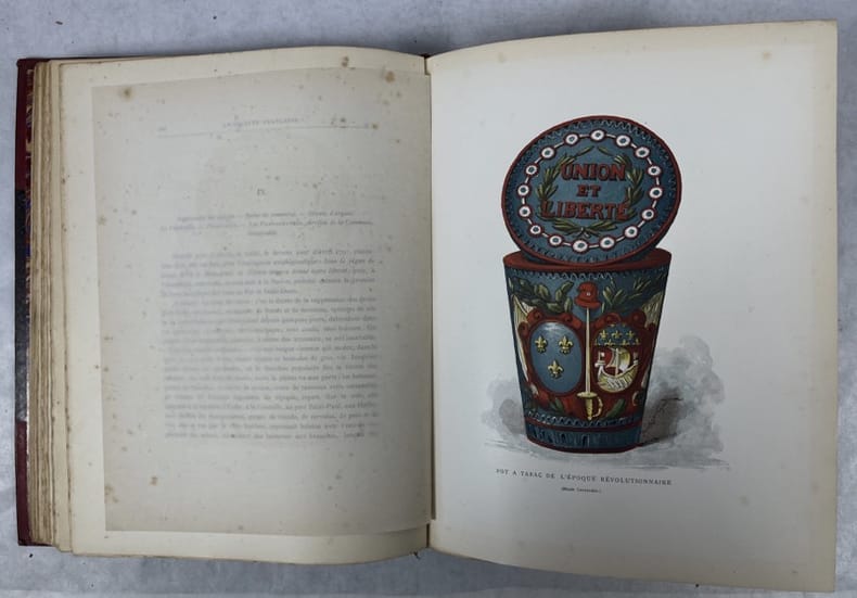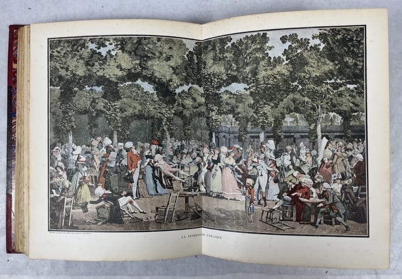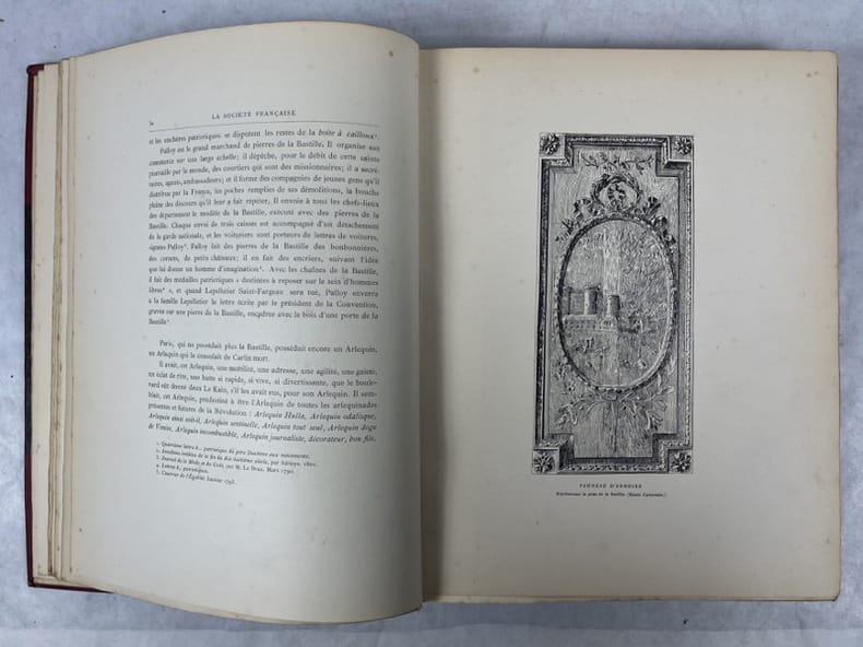 P., Maison Quantin, 1889. In-4 rel. (33 x 26,5 cm.), rel. de l'époque demi-maroquin bordeaux à coins bordés d'un double filet doré, dos à 5 nerfs, caissons dorés ornés d'un décor floral et cocarde, tête dorée, plats et gardes peignées, couv. d'origine conservée (fac-similé d'un morceau de papier de tenture d'appartement, fabriqué au commencement de la Révolution, et conservé au Musée Carnavalet), 374 pp., 44 planches h.-t., dt. 9 en coul., qq.-unes sur double page. Ex-libris gravé (P. Dablin).