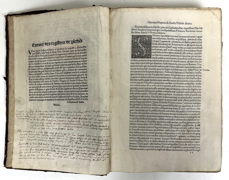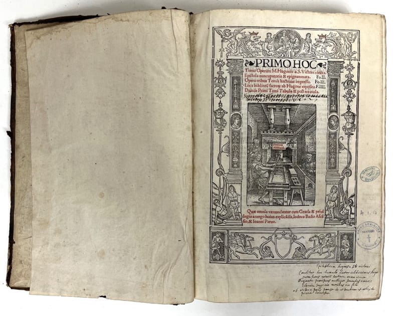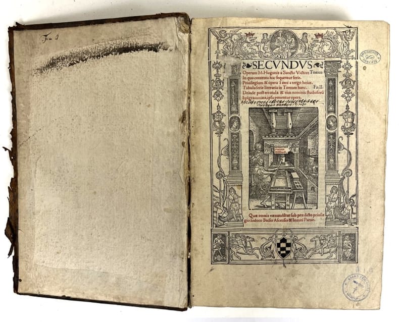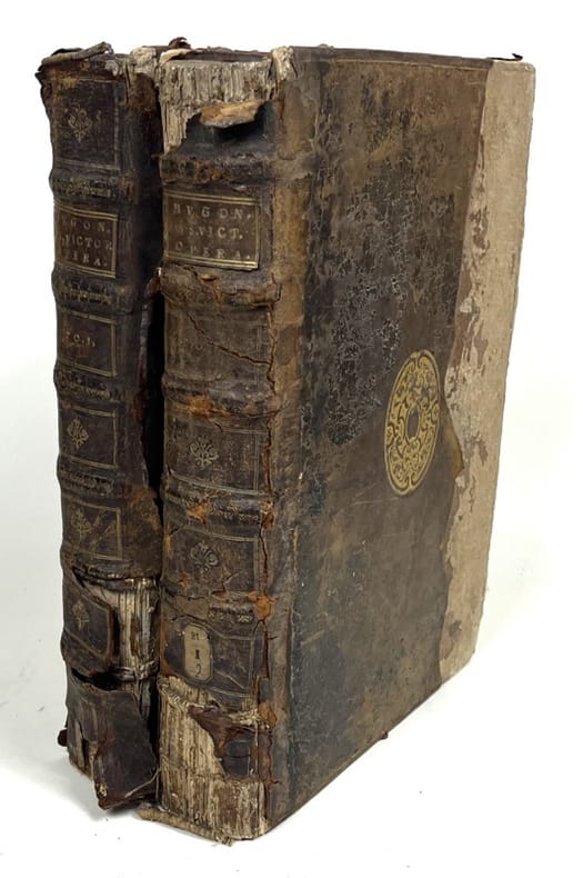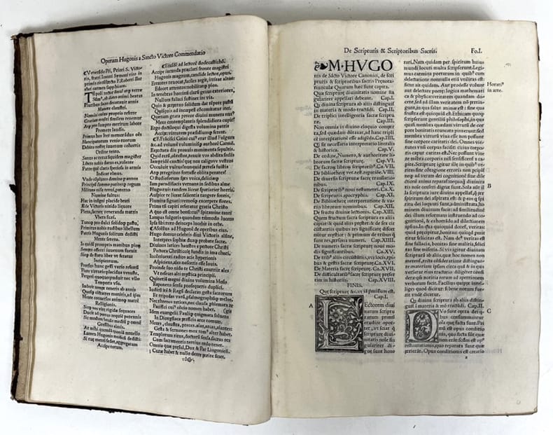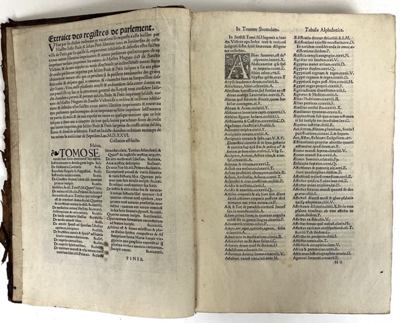 Texte en latin. Comprend : I. Epistola nuncupatoria et epigrammata, fo. II ; opera tribus tomis hactenus impressa, fo. III ; loca Bibliorum sacrorum ab Hugone exposita, fo. IIII ; deinde primi tomi tabula et post erratula - II. In quo contenta hac sequentur serie. Privilegium & opera Tomi ac tergo huius. Tabula serie literaria in Tomum hunc. Deinde post erratula & eius nominis studioforu Epigrammata, ipsa ponentur opera. Etat correct d’occasion