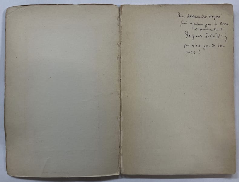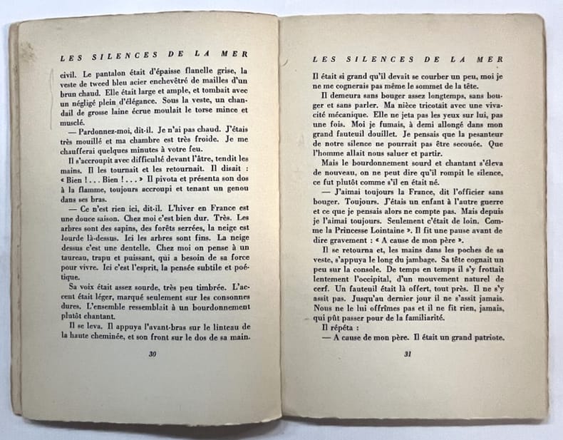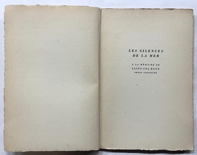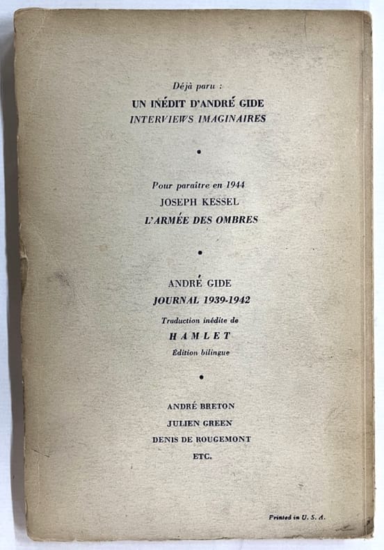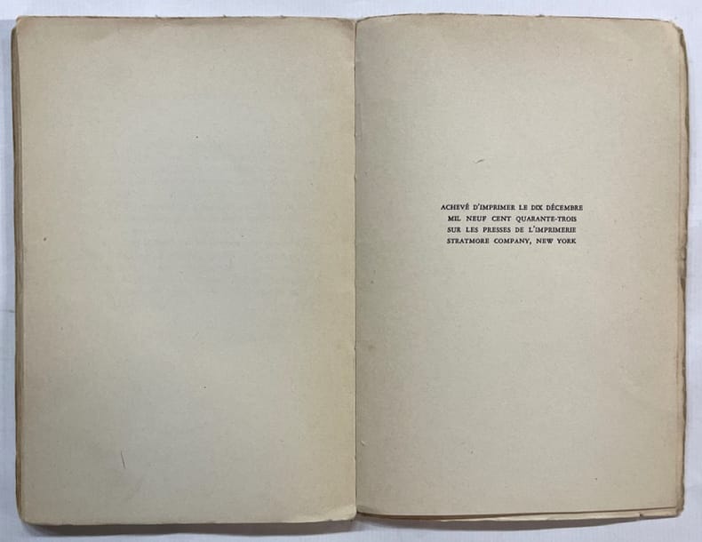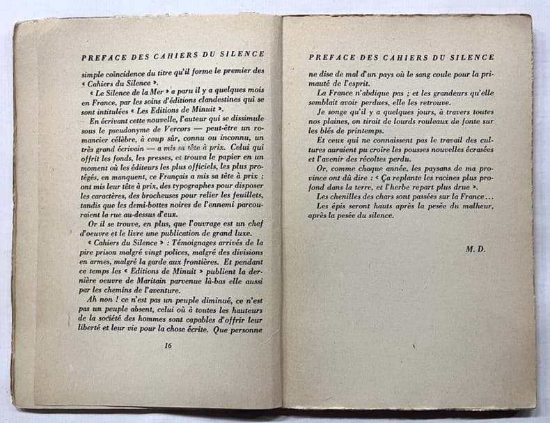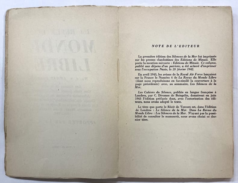 New York, Pantheon Books, Jacques Schiffrin 1943 In-12 19,5 x 13 cm. Broché, couverture imprimée, 68 pp. Quatrième édition, imprimée à New York, le 10 décembre 1943. D’abord publié le 20 février 1942, “Le Silence de la mer” fut le premier livre des éditions de Minuit, fondées à l’automne 1941 par Vercors et Pierre de Lescure. L’édition américaine emprunte le titre au sommaire de la “Revue du monde libre”, n 4, avril 1943, version imprimée sur papier bible, lancée sur la France par les avions de la Royal Air Force. La préface de Maurice Druon est celle de l'édition de Londres, coll. des “Cahiers du silence”, juin 1943. Notre exemplaire est enrichi d’une dédicace autographe de l’éditeur Jacques Schiffrin à Alexandre Koyré. couverture légèrement poussiéreuse, manques en tête et en pied de dos.