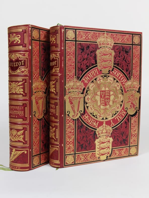 Hachette et Cie 1878 2 forts vol. in-4 28 cm sur 20, pleine reliure éditeur demi-chagrin cerise, richement décorée, dos à nerfs, caissons orné de fers spréciaux dorés et à froid, plats de percaline ornés d'un superbe décor d’armoiries anglaises noir et or autour de la devise de l’ordre de la Jarretière '' Honni soit qui mal y pense '', tranches dorées, 199 gravues dessinées sur bois dans le texte. 637- 785 pages. Rares rousseurs. Infimes usures. Bel exemplaire.