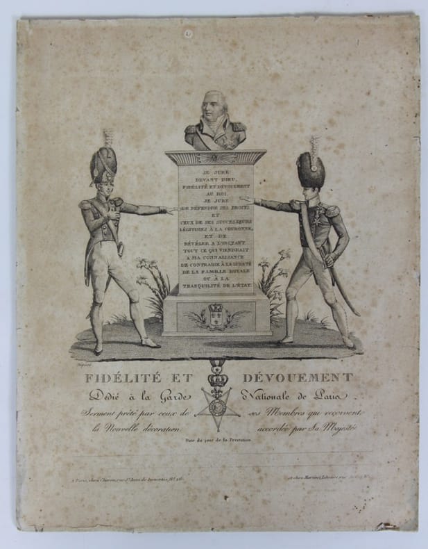 A Paris, chez Charon, rue Saint Jean de beauvais, N° 26. - et chez Martinet, Libraire, rue du Coq, N° 15 1816 Gravure à l'eau-forte sur carton, 30 x 22,7 cm. Rousseurs. Epreuve consécutive à l'ordonnance royale du 18 avril précédent, qui imposait la prestation du serment aux décorés du Lis. La formule du serment se lit sur le piédestal d'un buste de Louis XVIII