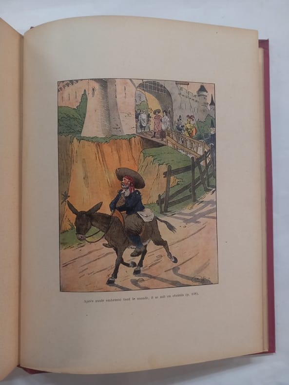 Paris, Librairie Delagrave 1925. Enorme in-4 cartonnage éditeur, pleine percaline rouge, de 127 pages au format 25, 5 x 33 cm. Magnifique couveture illustrée, polychrome. Dos rond avec titre et illustration en couleurs. Tête dorée. Coins avec infimes tassements. Intérieur très frais. Etiquette de remise de prix, collée en page de garde. Couverture, frontispice et 15 superbes illustrations, hors texte, en couleurs de René Giffey. Troisième édition de cette édition réduite et mise à la portée de la jeunesse par Paul Lefèvre-Géraldy. Superbe état. Rare, surtout dans un tel état de fraicheur.