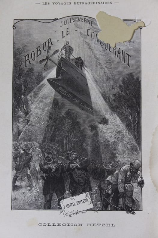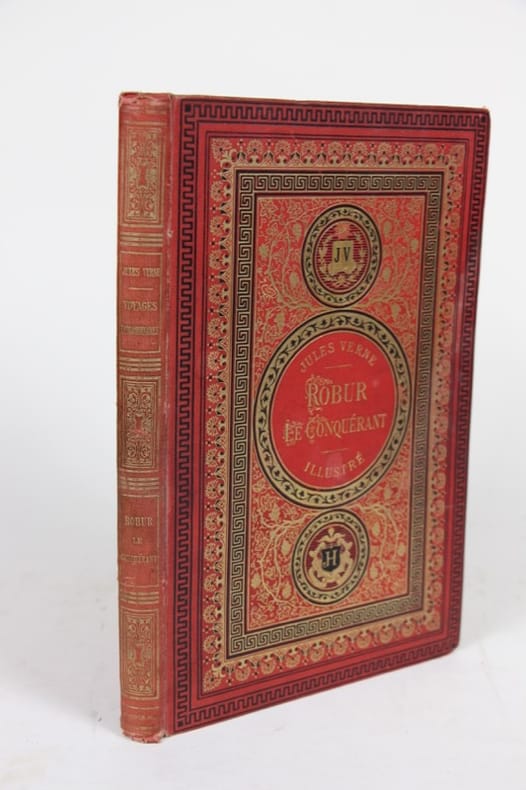 Paris, J. , impr. Gauthier-Villars, coll. « Bibliothèque d'éducation et de récréation » 1886 2 ouvrages en 1 volume. In-4 27,5 x 17,5 cm. Cartonnage éditeur pleine percaline rouge aux deux éléphants, ici Lenègre type 3, cartonnage qui suit le cartonnage à la bannière, plaque signée A. Souze, tranches dorées, 220 pp., 45 dessins par Benett, table des matières - 198 pp., 42 dessins par Georges Roux et 1 carte, table des matières. In fine, présence du catalogue DF 11 pp., catalogue des nouveautés de l’année 1886-1887 indexant Robur-le-Conquérant. Dos passé, petits accrocs en tête et en pied de dos, mors réparés, coins légèrement émoussés et frottés, rousseurs marginales, gouttière régulière.