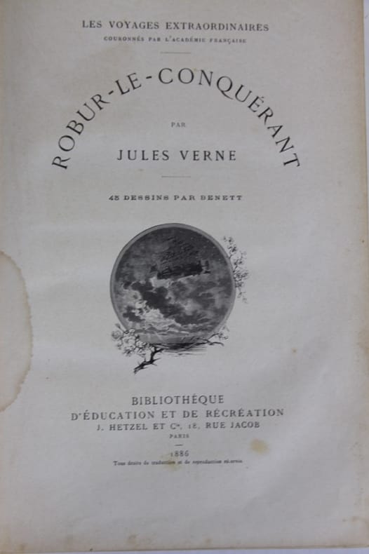 J. Hetzel et Cie, Paris, coll. « Bibliothèque d'Education et de Récréation » 1886 In-8 27,5 x 18,5 cm, relié, 220 pages et catalogue Hetzel DF in fine pour 1886-1887 Première édition en reliure cartonnage aux initiales par Magnier, second plat de type C2, tranche dorée,conforme à Jauzac page 113 illustré de 45 dessins par BENETT et bien complet des 4 planches hors texte Humidité. En l’état