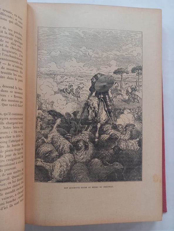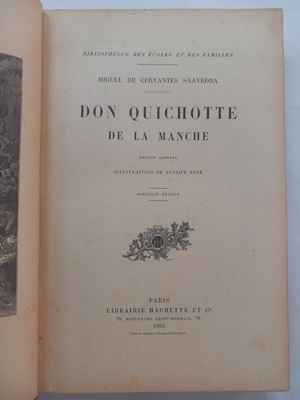 Traduit de l'Espagnol par Florian, suivi de deux nouvelles de Cervantès par le même. "Don Quichotte de la Manche" (en espagnol "Don Quijote de la Mancha") est un célèbre roman écrit par l'écrivain espagnol Miguel de Cervantes. Il a été publié pour la première fois en 1605, suivi d'une deuxième partie en 1615. Le livre est considéré comme l'une des œuvres littéraires les plus importantes et influentes de tous les temps. "Don Quichotte de la Manche" raconte l'histoire de Don Quichotte, un gentilhomme espagnol qui, après avoir lu trop de romans de chevalerie, devient fou et décide de se prendre pour un chevalier errant. Il prend le nom de Don Quichotte, équipe une vieille armure et part à l'aventure pour défendre la justice et secourir les opprimés. Il est accompagné de son fidèle écuyer, Sancho Panza. Le roman est célèbre pour sa satire des romans de chevalerie de l'époque et pour son exploration des thèmes de la réalité et de la folie. Don Quichotte perçoit le monde à travers le prisme de ses lectures, transformant les situations ordinaires en aventures chevaleresques. Le livre est également une méditation profonde sur l'idéalisme et l'imagination, ainsi que sur la manière dont la littérature peut influencer la perception de la réalité. Complet en 3 volumes gd in8, 23x15, reliures demi cuir, frottements et accrocs, bon état intérieur, 357, 357, 364 pages. Sans les figures annoncées par le relieur. Paris, Chez Birand, éditeur, 1830 ref/267