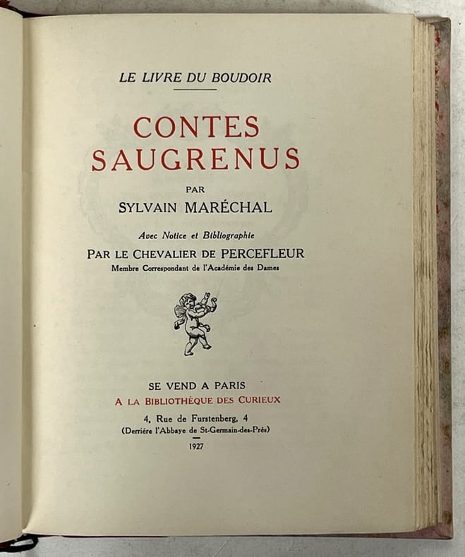 Paris, Bibliothèque des curieux, coll. « Le Livre du boudoir » 1927 In-16 16,5 x 12,5 cm. Reliure demi-chagrin havane, filets dorés,dos à nerfs encadrés de petits fers dorés, couvertures et dos conservés, 145 pp., bandeaux et culs-de-lampe, notes, bibliographie, table des matières.