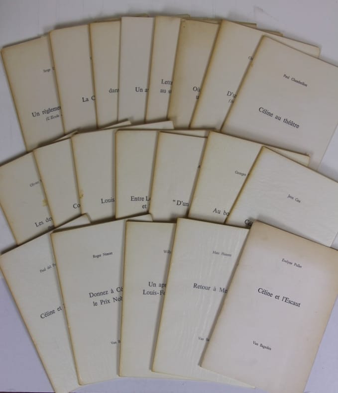 Ensemble quasiment complet de cette très rare série de plaquettes constituées d'inédits écrits par les spécialistes ou admirateurs de Céline et publiée par Marc Laudelout à la fin des années entre 1986 et 1991. Manque : Lucien REBATET, « Céline soi-même », Céliniana n°4, Pierre-Antoine COUSTEAU, « D'un râtelier l'autre », Céliniana n°16, Éric MAZET, « Céline : d'un peintre à l'autre », Céliniana n°23. Très bon état d’occasion