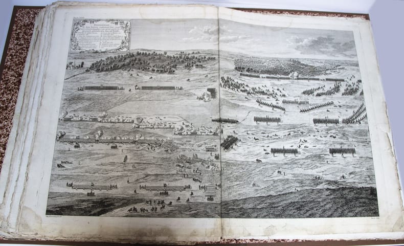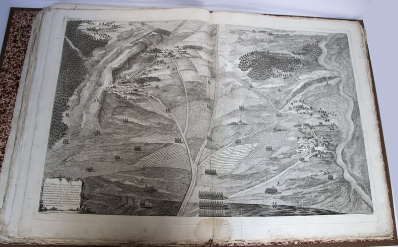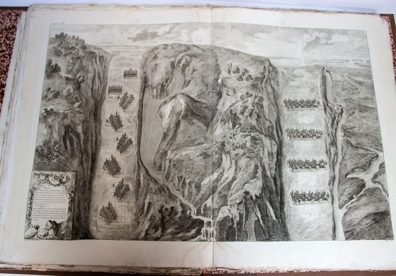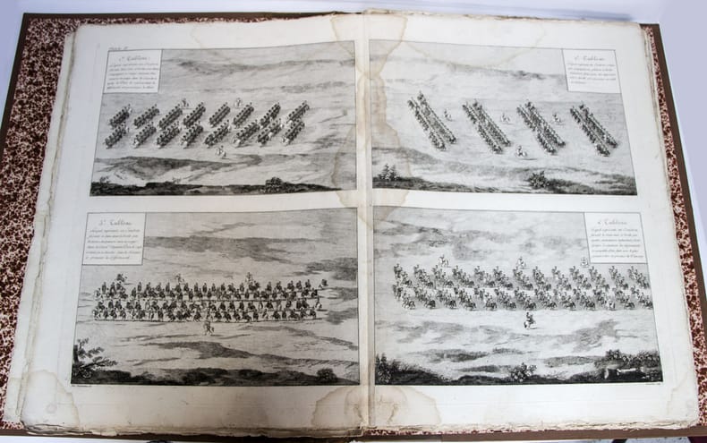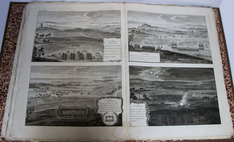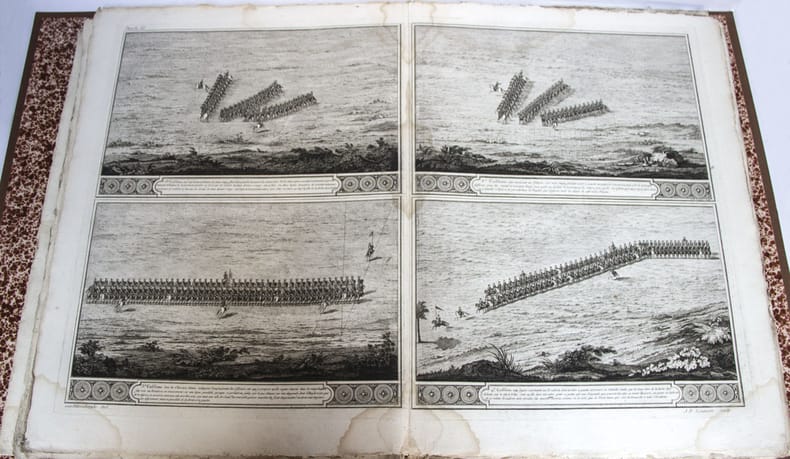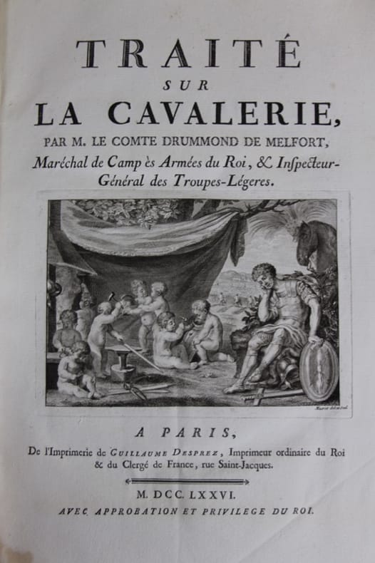 Édition originale de ce célèbre traité sur la cavalerie, l’un des plus spectaculaires qui ait jamais été édité. Le traité en lui-même, orné d’un beau frontispice par Pierre Charles Ingouf, représentant Louis XVI passant en revue les troupes à cheval, d’une vignette de titre par Macret et de 4 en-têtes et 3 culs-de-lampe gravés par divers artistes d’après Van Blaremberghe, est illustré de 11 planches de tactique elles aussi gravées sur cuivre, dont 7 à double page et une repliée L’atlas comprend quant à lui 32 planches à double page dont 1 repliée, gravées sur cuivre par divers artistes d’après Van Blaremberghe. « Ces superbes pl représentent différentes parties de l’Instruction individuelle du Cavalier et du dressage, ainsi que les formations et mouvements tactiques de la Cavalerie. Ce ne sont pas de simples plans : chaque cavalier, chaque cheval est dessiné individuellement, et les scènes sont placées au milieu de paysages variés”. (Mennessier de la Lance). Bon état d’occasion