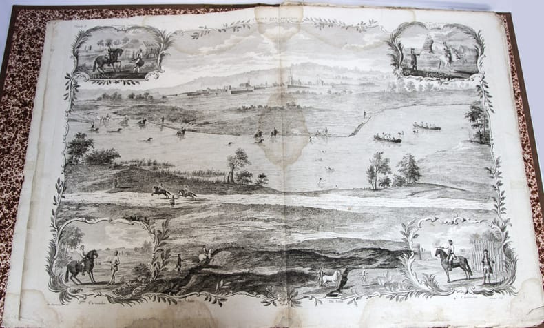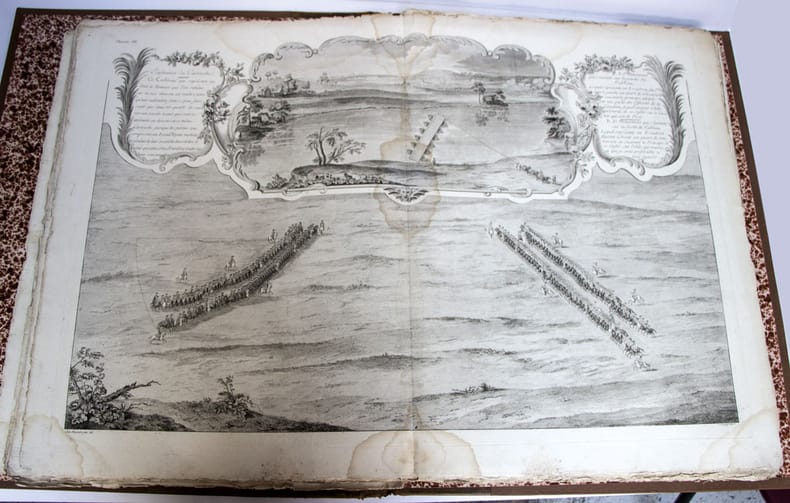 P., Guillaume Desprez 1776 2 volumes, pleine basane moucheté à l’imitation, dos à nerfs, caissons ornés, filets et dentelles. Texte in-folio de xxii, 2- 505- 2 pp. Atlas in-plano de 32 planches doubles dont certaines dépliantes numérotées et 2 pl. non numérotées, sous chemise demi-basane et étui. Humidité marginale et centrale en continue. En l’état.