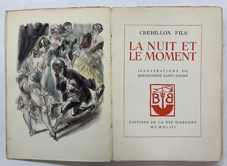 1943 Paris. Éditions de la Nef d'Argent. 1943. Gd in-8 broché couverture illustrée d'un bois gravé en couleur, , 79 pages, 16 illustrations couleurs et "coquines"hors texte. Tirage à 1500 exemplaires. ,numéro 420 sur vélin pur chiffon