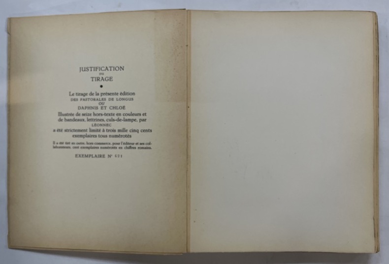 Paris, Floury, impr. Presses du Maître-imprimeur R. Coulouma, à Argenteuil 1934 In-4 26,5 x 21 cm. Broché, couverture beige rempliée, auteur & titre en bleu et noir sur le dos et le premier plat de couverture orné d’une vignette, 121 pp., vignette en page de titre, édition illustré de 16 hors texte en couleurs et de bandeaux, lettrines, culs-de-lampe par Georges Léonnec. édition limitée à 3500 exemplaires tous numérotés, celui-ci N 421.