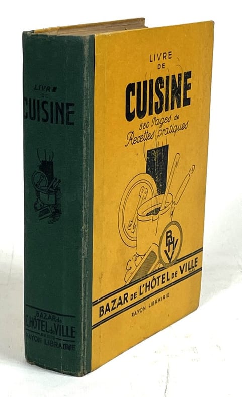 Paris, Bazar de l’Hôtel de Ville. Rayon librairie 1930 In-12 18,5 x 13,5 cm. Cartonnage éditeur demi-toile verte, titre en noir sur le dos et le premier plat de couverture orné d’une figure, 559 pp., de recettes pratiques, table des matières.