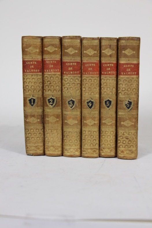 Complet des 6 gravures de Moreau en frontispice Complet en 6 volumes, 6° volume étant intitulé : La théorie du Bonheur ou l'art de se rendre heureux, mis à la portée de tous les hommes, faisant suite au Comte de Valmont. volumes reliés plein cuir, tranches dorées, très bel état, 18x11, XVI, 393 - 371 - 375 - 335 - 350 - 430 pages. Paris, Masson & Fils, 1821 Oeuvre qui s'inscrit dans le courant littéraire du libertinage, caractérisé par des récits licencieux et subversifs. L'histoire tourne autour du personnage du comte de Valmont, un séducteur immoral et manipulateur qui cherche à assouvir ses désirs sexuels sans scrupules. Le roman est composé de lettres échangées entre les personnages, qui dévoilent les intrigues amoureuses, les manipulations et les tromperies de Valmont. L'œuvre explore les thèmes de la passion, de la séduction et des conséquences de la recherche du plaisir sans limites. "Le Comte de Valmont ou les égarements de la raison" est souvent comparé à "Les Liaisons dangereuses" de Pierre Choderlos de Laclos, car les deux romans présentent des protagonistes libertins et mettent en lumière les jeux de pouvoir et les manipulations au sein de la haute société. L'auteur était un écrivain réputé pour son style raffiné et son exploration des passions et des vices humains. "Le Comte de Valmont ou les égarements de la raison" est considéré comme l'une de ses œuvres les plus célèbres et les plus controversées, offrant une vision sombre et critique de la société de l'époque. ref/24/8