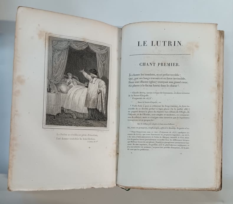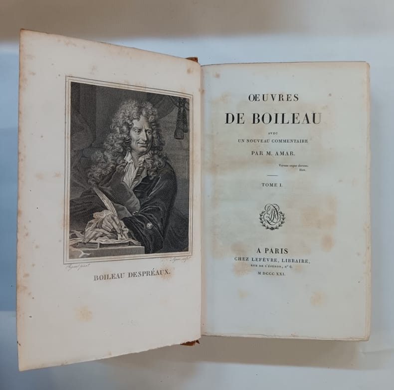 4 volumes grand in-8 illustré : 2f., xxxvj et 424p. ; 2f., xxij et 448p. ; 2f., xvj et 487p. ; 2f., iii et 512p. :: Edition imprimée par P. Didot l'Ainé et illustrée d'un portrait de l'auteur d'après Rigaud gravé par Lignon et de 6 hors-texte d'après Desenne pour "Le Lutrin". :: Exemplaire sur papier vélin avec les hors-texte et le portrait avant la lettre. :: Très belle reliure de René Simier, dit Simier père, qui fut relieur de roi pendant la Restauration (mort en 1837). :: Maroquin rouge à grains longs, dos orné à froid et doré, 4 nerfs sautés, plats encadrés de dentelles dorées et à froid et de flerons aux angles, dentelle intérieure, tranches dorées (Simier, rel. du roi). Au tome 4, une charnière fendillée et une petite tache sur un plat. Rousseurs assez fortes par endroits.