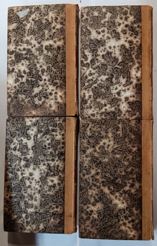 Lefévre, librairie 1822 4 volumes. In-8 22,8 cm sur 13,5 demi basane fauve, dos lisse, caissons à froid, filets et dentelles dorées. 424, 448, 487, 512 pages. Charnières fendillées mors en tête fragiles, coiffes u peu usées. Rares rousseurs sinon bon état d’occasion.
