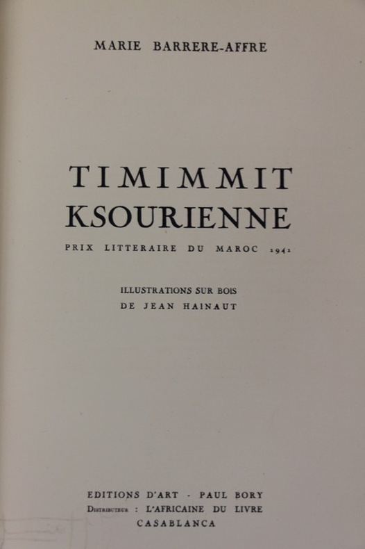 Paris - Casablanca, Editions d’Art - Editions Paul Bory, L’Africaine du Livre 1944, 250x195mm, 249pages, broché. Dédicace de l’éditeur Paul Bory destinée à Henri Gournag (correcteur du Timimmit) et aussi signés par l’auteur et l’illustrateur sur la page de faux-titre. Exemplaire sur vergé non justifié. Petite déchirure sur le bas du dos, autrement bel exemplaire.