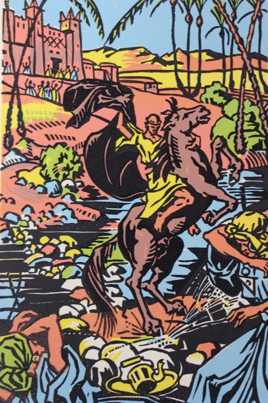 Casablanca, Editions d'art Paul Bory, 1944, pt in-4°, 253 pp, 19 bois hors texte dont 8 en couleurs et 1 en bleu, lexique à l'usage des non-berbérisants in fine (4 pp.), broché, non coupé, couv. illustrée, chemise et étui, bon état. Edition originale tirée à 975 ex. numérotés seulement, celui-ci un des 300 ex. sur vergé numérotés de 201 à 500 (n° 436) auxquels il a été ajouté une suite tirée en noir et une couleur des huit premières planches. Exemplaire signé par l'auteur et l'illustrateur