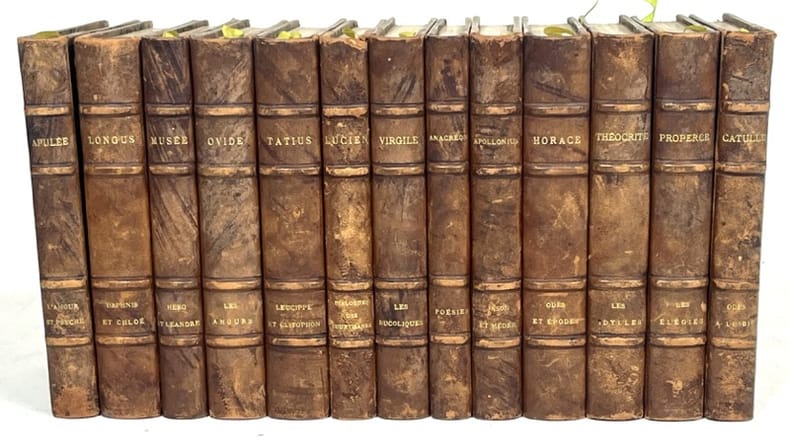 Comprend : 1. Longus, Daphnis et Chloé, avec une grecque pour encadrement et des en-têtes genre étrusque, par Scott, 1878 - 2. Apulée, L'Amour et Psyché, avec un encadrement XVIIIe siècle et des en-têtes d’après Natoire, 1878 - 3. Ovide, Les Amours, illustré de nombreux en-têtes en trois tons, gravures de Méaulle dessins de Meyer, 1879 - 4. Musée, Héro et Leandre, illustré avec en-têtes et cadres en grisaille, gravures de Méaulle, 1879 - 5. Tatius, Leucippe et Clitophon, illustré d’en-têtes tirés en camaïeu, gravures de Méaulle, 1880 - 6. Virgile, Les Bucoliques,illustré d’en-têtes et de cadres tirés en bistre, illustrations de Leloir, 1881 - 7. Lucien, Dialogues des courtisanes, illustré d’en-têtes en couleur et fond d’or, illustrations de Scott et Méaulle, 1881 - 8. Apollonius de Rhodes, Jason et Médée, illustré d’en-têtes genre biscuit de Sèvres, encadrement bleu faïence, gravures de Méaulle, 1882 - 9. Poésies de Anachréon et de Sapho, illustré d’en-têtes en plusieurs tons, illustrations de Avril, 1882 - 10. Horace, Odes et épodes, illustré d’en-têtes en couleur à cadre doré, gravures de Méaulle, 1883 - 11. Théocrite, Les Idylles, illustré d’en-têtes en couleur et or, gravures de Méaulle, 1884 - 12. Properce, Les élégies, illustré d’en-têtes genres bas-reliefs florentins, dessins de Besnier, gravures de Méaulle, 1885 - 13. Catulle, Ode à Lesbie et épithalame de Thétis et Pelée, illustrations de Poirson, 1889. Bon état d’occasion