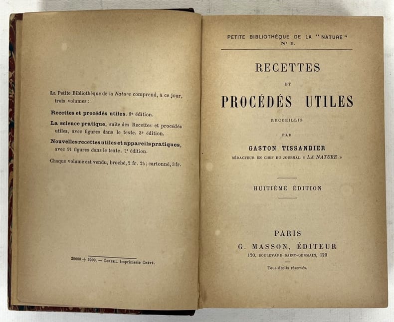 Véritable encyclopédie des techniques et astuces pour détacher, nettoyer, et autres procédés nécessaires dans le vie de tous les jours à la fin du XIXe s. ou tout début du XXe S. De véritables idées à récupérer ! Bon état d’occasion
