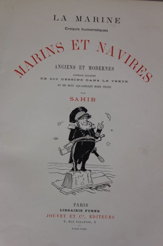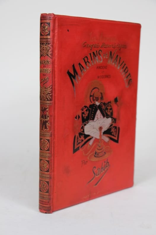 1890, Jouvet et Cie, in-folio pleine toile rouge de 148 pages, couverture illustrée par un dessin de SAHIB or et noir, titrage or et noir sur dos et couverture, tranches dorées, La marine, croquis humoristiques, Marins et navires anciens et modernes, ouvrage illustré de 200 dessins dans le texte et de huit aquarelles hors texte | Etat : Etat correct, couverture défraîchie et usée, quelques frottements, quelques rousseurs (Ref.: G4998)
