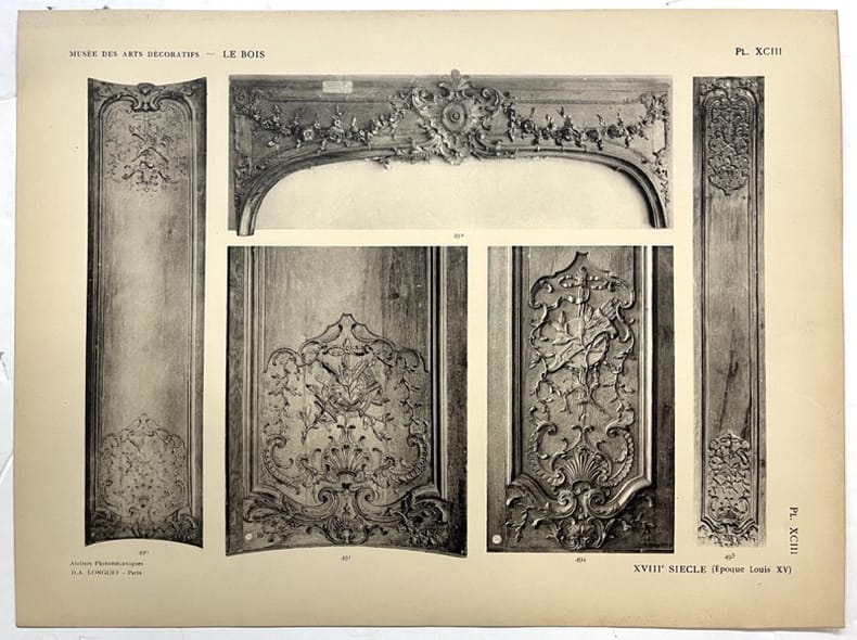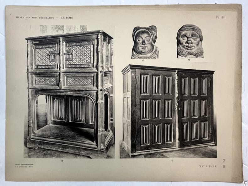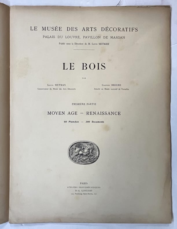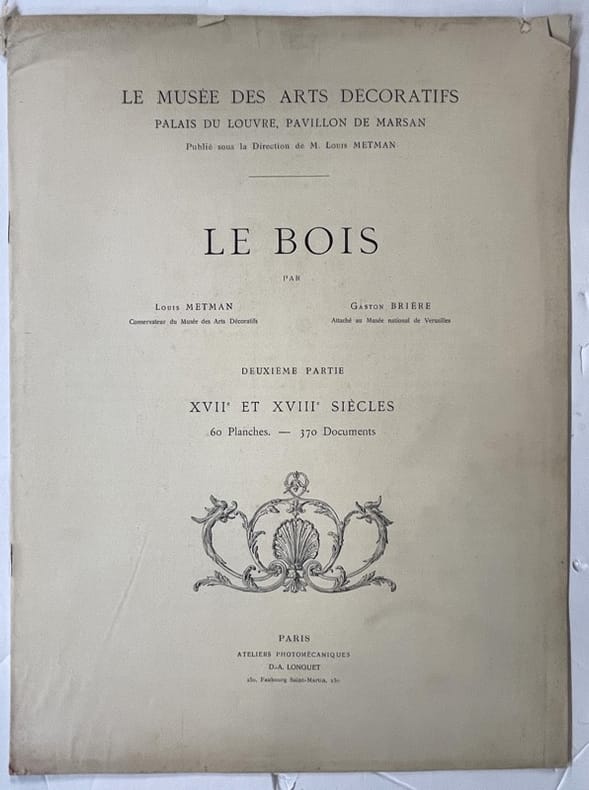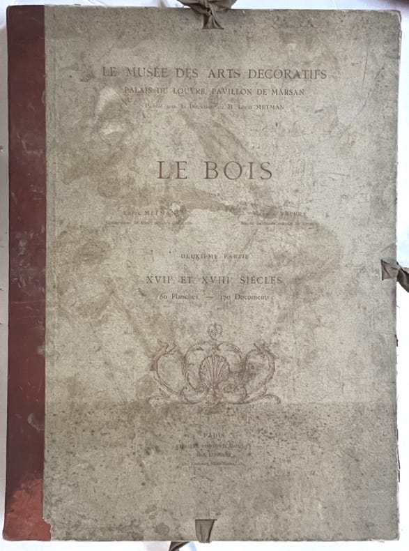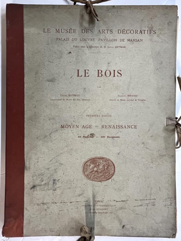 2 parties en 2 volumes.Le Musée des Arts décoratifs Palais du Louvre, Pavillon de Marsan, publié sous la Direction de M. Louis Metman.Le Bois par Louis Metman, Conservateur du Musée des Arts Décoratifs et Gaston Brière Attaché du Musée national de Versailles.Première partie. Moyen age - Renaissance - 60 Planches - 300 Documents.Deuxième partie. XVIIe et XVIII siècles - 60 Planches et 370 DocumentsParis, Ateliers Photographiques D.-A. Longuet - non daté (vers 1890).Pages volantes sous couverture cartonnée, imprimée, à lacets. Dos toilé. Bon état. Format in-folio(38×29).