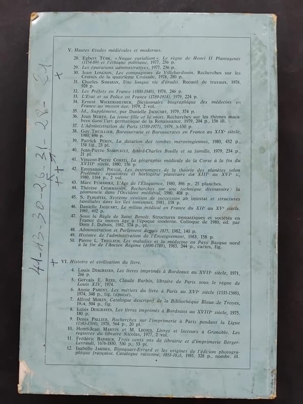 Librairie Droz 1983 In-8 broché 24,3 cm sur 15,8. 452 pages. Couverture défraîchie, frottée, salie et effrangée, inscription manuscrite au stylo liste de nombres sur le quatrième de couverture, intérieur propre. État correct d’occasion.