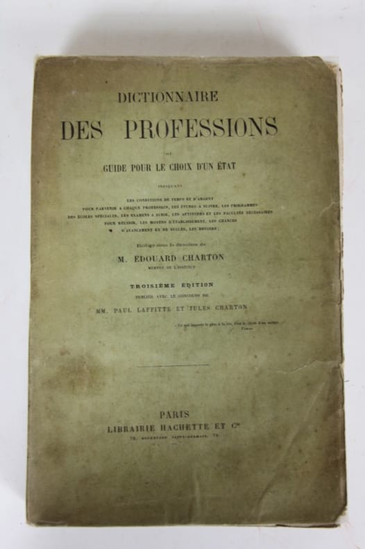 Bon état Troisième édition, 1/2 reliure, dos à nerfs orné du titre et de fleurons dorés, dictionnaire indiquant les conditions de temps et dargent pour parvenir à chaque profession, les études a suivre, les programmes, etc... rédigé sous la direction de M. Edouard Charton, publiée avec le concours de M.M. Paul Laffitte & Jules Charton,557 pages, format : 28.5 x 19 cm , poids : 2 kg - largeur/hauteur :x cm - poid : g - nombre de pages : p. - langue :