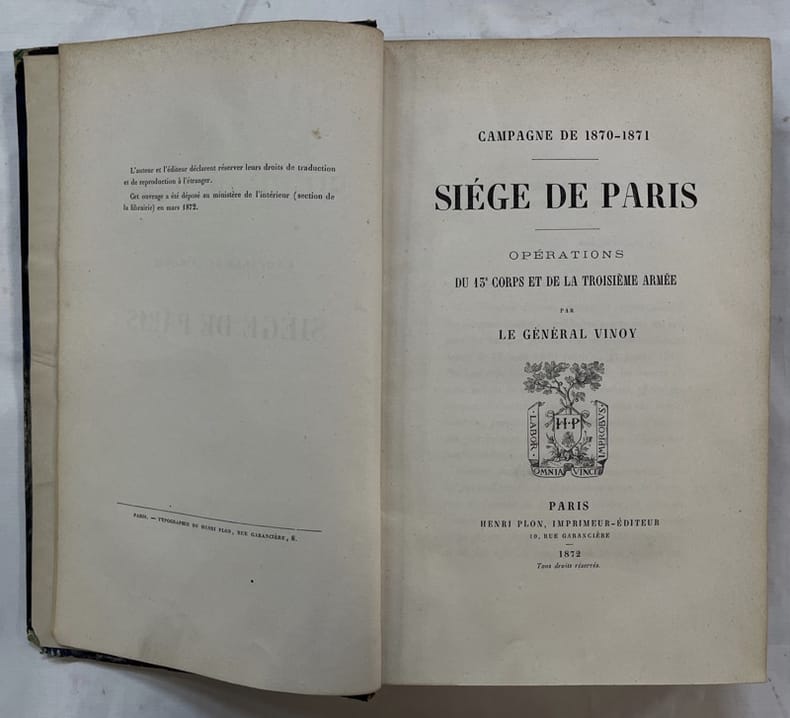 Rappelé pour la guerre franco-allemande, le général Vinoy (1800-1880) succède le 22 janvier 1871 à Trochu comme commandant en chef de l'armée de Paris. Le 11 mars, il supprime les journaux révolutionnaires ; le 18 mars, obéissant à Thiers, il donne l'ordre de retraite générale sur Versailles. Bon état d’occasion