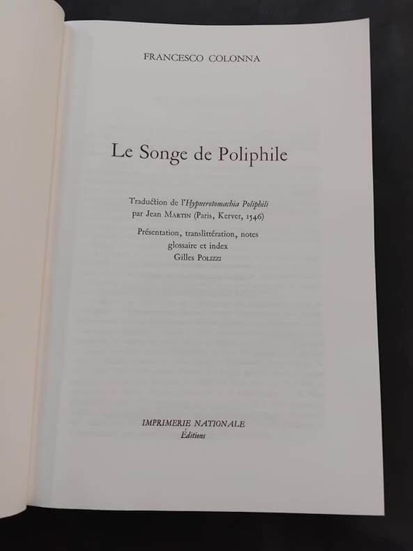 Paris, Imprimerie Nationale, "La Salamandre", 2008, 15 x 20,5, 516 pages cousues sous couverture rempliée illustrée. Présentation, translittération, notes, glossaire et index par Gilles Polizzi. Traduction de l"Hypnerotomachia Poliphili" par Jean Martin (Paris, Kerver, 1546).