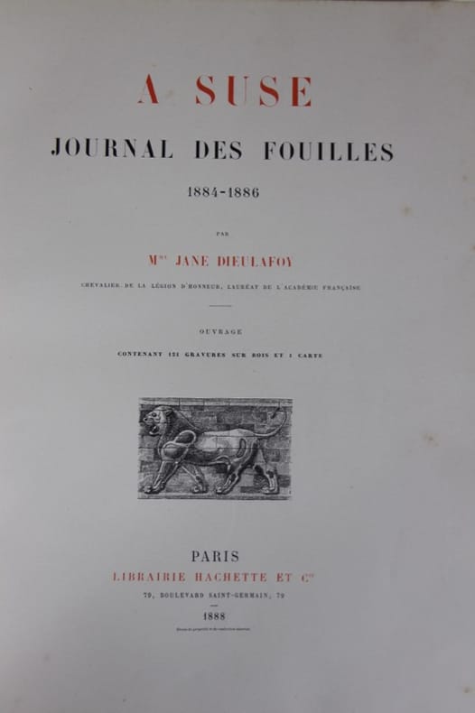 Marcel Dieulafoy (1844-1920), ingénieur polytechnicien versé dans l'étude de l'art antique de l'Iran (notamment Persépolis), et son épouse Jane (1851-1916), femme aux talents mutiples, conduisent de 1884 à 1886 deux campagnes de fouilles, avec un financement des Musées Nationaux. L'exploration concerne surtout le palais perse, où la “frise des lions” puis la “frise des archers” sont dégagées, puis rapportées en France, avec également un chapiteau de l'Apadana quasiment intact. Ils seront restaurés et exposés au Louvre. C'est ce second séjour qui correspond aux fouilles de Suse, exécutées dans des conditions des plus difficiles, et que Jeanne couvre dans ce Journal. Bon état d’occasion