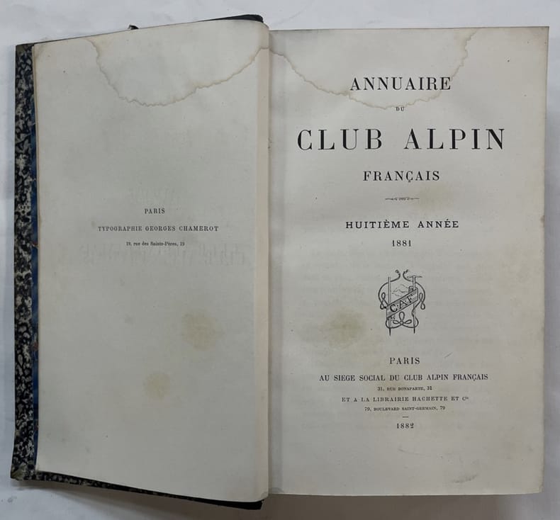 Paris, Club Alpin Français 1882 In-8 22,5 x 13,5 cm. Reliure demi-basane noire, dos à nerfs encadrés de petits fers dorés, XI-512-146 pp., 2 cartes, 26 illustration et figures, table méthodique, bibliographie, cartographie, table alphabétique, liste des membres. Reliure frottée.