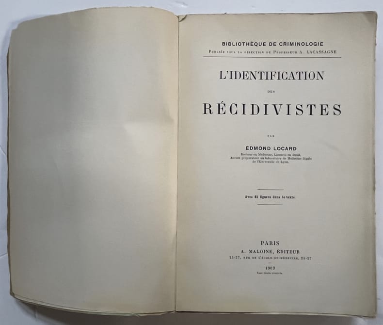 Paris, A. Maloine, 1909, in-8, [2]-IV-428 pp, Broché, couverture imprimée de l'éditeur, ÉDITION ORIGINALE de ce traité en criminologie d'Edmond Locard (1877-1966), le fondateur du premier laboratoire de police scientifique à Lyon en 1910 et, plus généralement, de la criminalistique. Il entretint une correspondance avec le célèbre auteur Conan Doyle qui s'inspira de ces travaux lors de la rédaction de ses ouvrages. Cet ouvrage est illustré de 85 figures dans le texte, il aborde toutes les facettes de l'identification judiciaire dont la photographie, la reconnaissance des marques particulières, le bertillonage ou la dactyloscopie. Un ouvrage très recherché. Dos gauchi, quelques pliures. Petits manques ou déchirures marginaux à la couverture, dos cassé, quelques rousseurs, un plat détaché. Ex-libris N.H. Couverture rigide