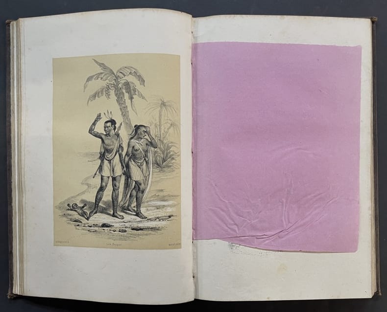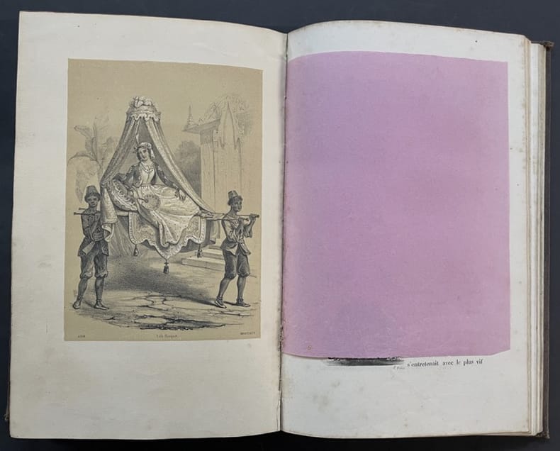 Paris Fayé s.d. (vers 1850) In-8 (26,5 x 17,5 cm.) 280 pp. pleine percaline noire, plat décoré d'une belle plaque dorée représentant un groupe d'indigènes tenant par le licol une girafe, sous un porche oriental, dans un encadrement polychrome bleu et rouge et un encadremet à froid. Dos et second plat avec un décor polychrome et à froid, tranches dorées, gardes de papier jaune. 15 lithographies hors-texte tirées sur chine contrecollées.