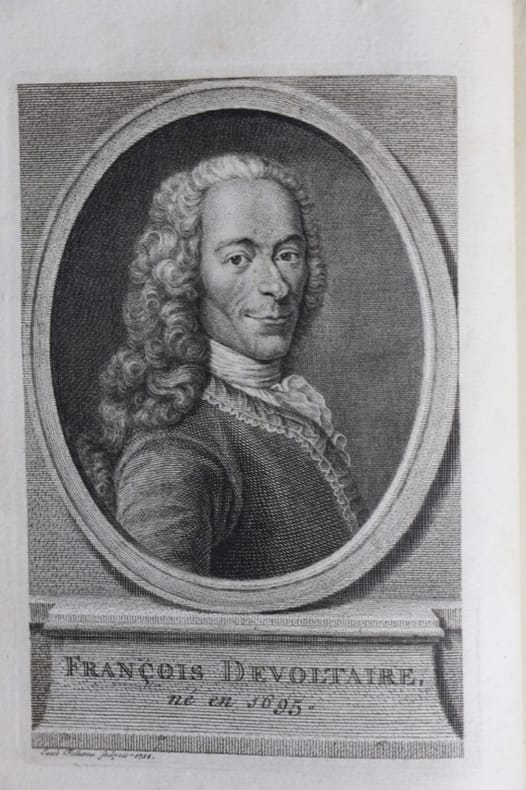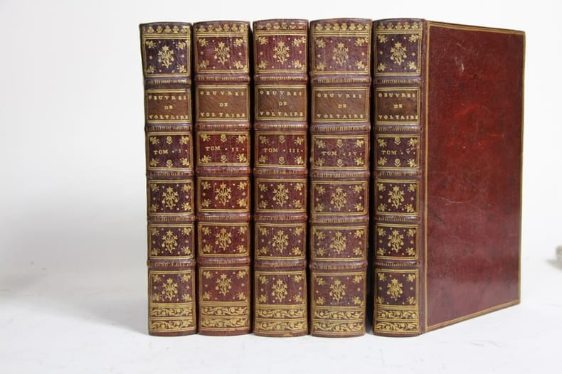 Amsterdam und Leipzig Arkstée und Merkus 1743 5 volumes in-8, plein maroquin grenat, dos à nerfs, caissons ornés, filets en coupes et sur les plats, dentelles en contreplats, tranches dorées. Grifures aux plats du volume 3. Menus frottement. Bon exemplaire, agréablement relié, de cette édition reprise sur celle de 1738 établie avec la collaboration de Voltaire. Vol.1, Préface sur la Henriade, par Linant ; Traduction d'une Lettre de M. Antoine Cocchi, lecteur de Pise, à M. Rinuccini, secrétaire d'État de Florence, sur "la Henriade", traduction par le B[ar]on Elderchen ; Histoire abrégée des événemens sur laquelle est fondée la fable du poème de la Henriade ; Idée d'Henriade ; la Henriade ; XXXII, 1 errata, 245 p., Frontispice & 11 planches lég. brunissure en tête ; Vol. 2. L'Œdipe ; la Mariamne ; le Brutus, 366 pp. & errata, 3 planches; Vol, 3 La Zayre ; l'Alzire, ou les Américains [sans la Mort de César ; l'Indiscret & l'Enfant prodigue reprises dans le volume 5.] avec : l’Essai sur la poésie épique. 3 feuillets, XIX, 228 pp. & pp. 249 à 349, 2 planches. Vol. 4. Le Temple du goût ; Épître à M. le duc de Sulli, à Paris, le 18 août 1720 ; Épître à M. le Mal de Villars ; Fontaine-Martel ; Épître à Mme de *** Du Châtelet sur la calomnie ; À M. de Fontenelle, de Villars, 1er septembre 1720 ; Réponse ; Lettre à M. de La Faye ; le Mondain, ou l'Apologie du luxe ; Lettre de M. de Melon, à Mme la Ctesse de Verrue sur "l'Apologie du Luxe" *** en lui envoyant les œuvres mystiques de Fénelon ; À la même Mme de ***, "De votre esprit la force est si puissante." ; Mélanges de littérature et de philosophie, chap. I-XXVII : de la Gloire, ou Entretien avec un Chinois du Suicide, ou de l'Homicide de soi-même ; Réflexions sur les Anglais Lettres philosophiques I-XXIV ; Sur les "Pensées" de M. Pascal Lettre XXV ; Table des principales matières.] 3 feuillets, 377 pp., 9 feuillets. Volume 5 : la Mort de César, tragédie ; l'Indiscret, comédie, pp. ch. 231- 372 & l'Enfant prodigue,comédie, 135 pp. 3 planches.