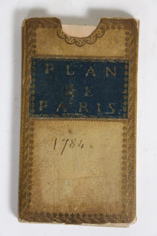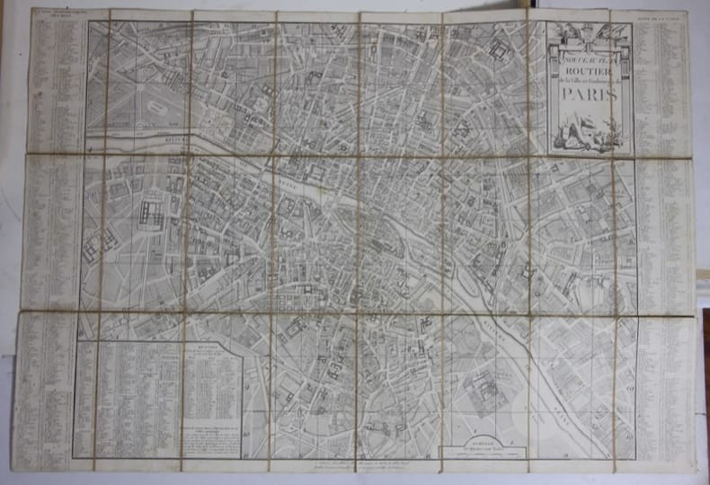 Paris, Alibert, Esnauts et Rapilly, 1784 En 24 sections montées sur toile et pliées, formant une carte de 570 x 812 mm, sous étui 1784. Ce plan reproduit de très près le plan routier de Lattré publié entre 1768 et 1788 Boutier, 323. Il est orné d'un cartouche de titre aux armes de la ville de Paris, avec, de chaque côté, une table alphabétique des rues, paroisses, collèges, hôpitaux, etc.