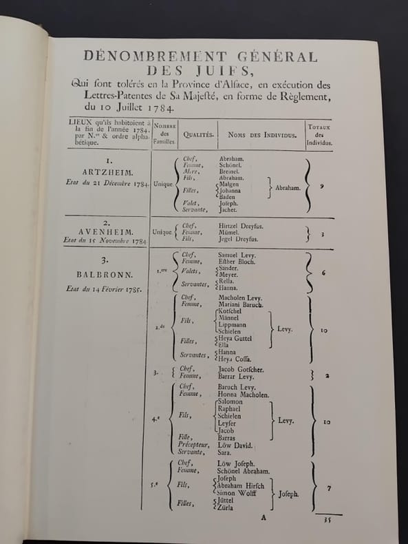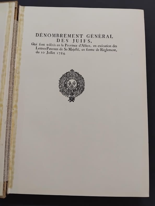 Dénombrement général des Juifs qui sont tolérés en la Province d'Alsace, en exécution des Lettres-Patentes de Sa Majesté, en forme de règlement, du 10 Juillet 1784 (A Colmar, Chez Jean-Henri Decker, 1785). (Strasbourg: Willy Fischer, 1975). [M.C.: Judaica, Alsace, histoire]