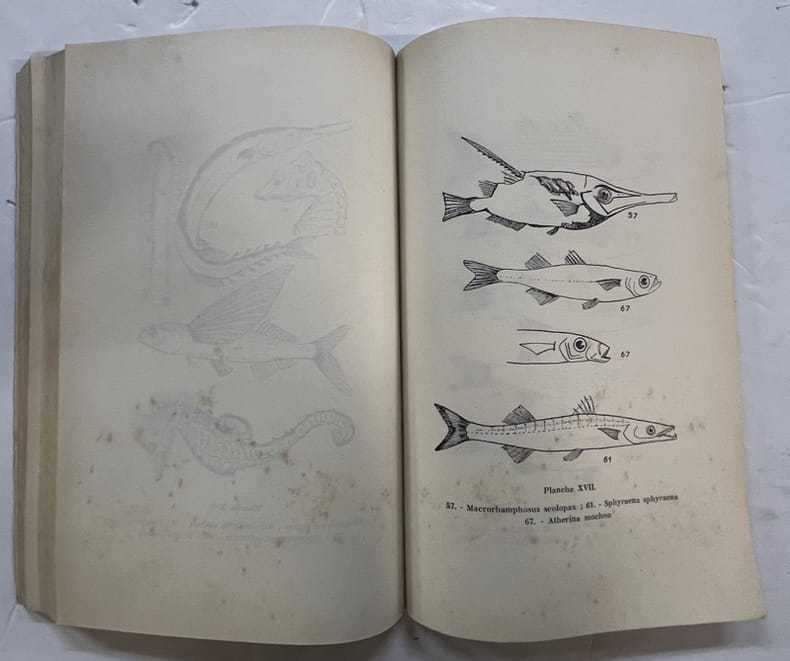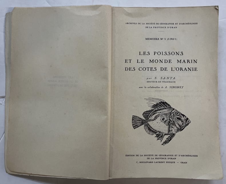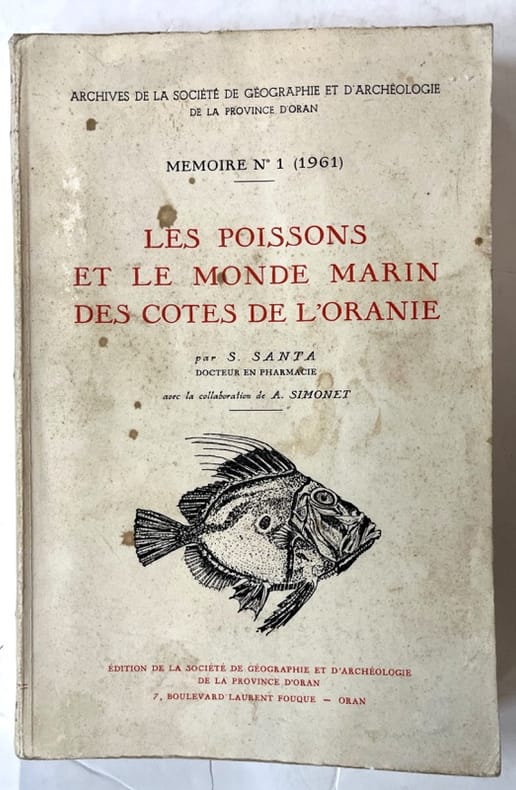Oran Edition de la Société de Géographie et d'Archéologie de la Province d'Oran 1961 in 8 (24x15,5) 1 volume broché, couverture illustrée, 313 pages, suivies de 61 planches hors-texte de dessins d'espèces de poissons de l'Oranie, Archives de la Société de Géographie et d'Archéologie de la Province d'Oran, mémoire n°1. Envoi autographe signé par l'auteur. Bel exemplaire ( Photographies sur demande / We can send pictures of this book on simple request )
