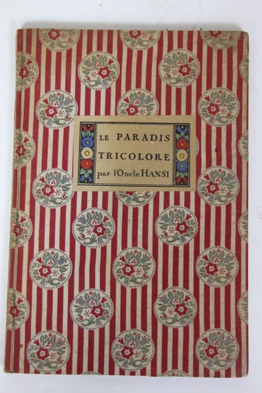 Paris, H. Floury, 1918. In-4. Cartonnage pleine toile à bandes rouges et blanches, ornée de motifs floraux avec vignette de titre contrecollée sur le premier plat. Gardes illustrées. Tranches rouges. 39 pages. Illustré de dessins en couleurs de Hansi. Bon état