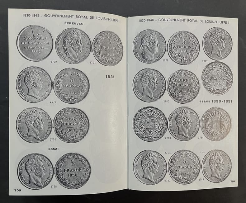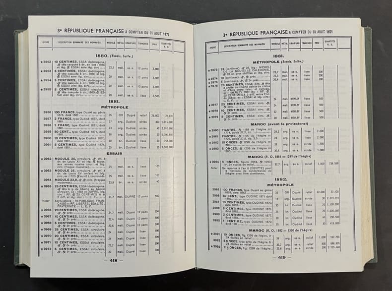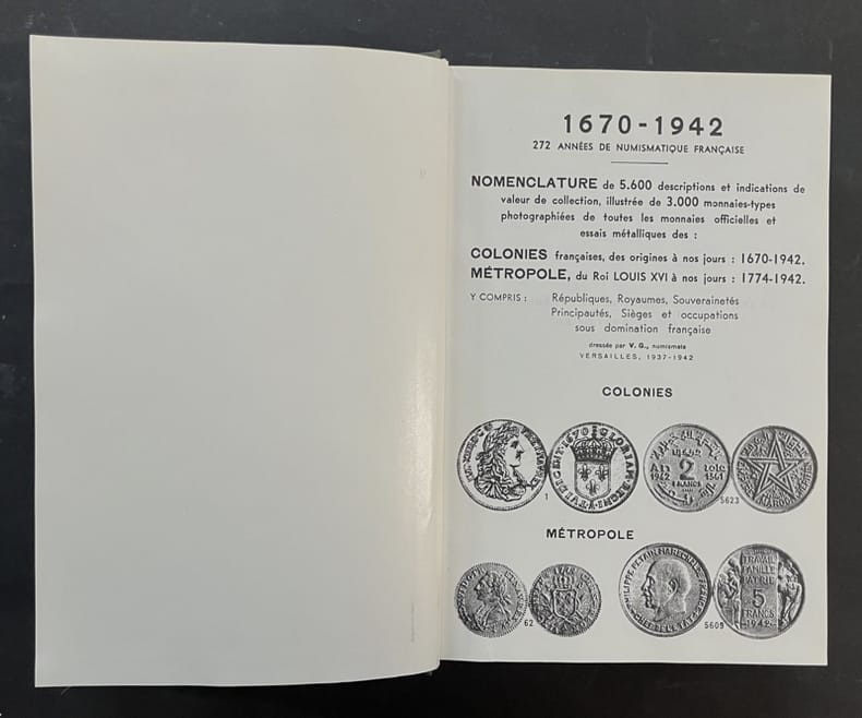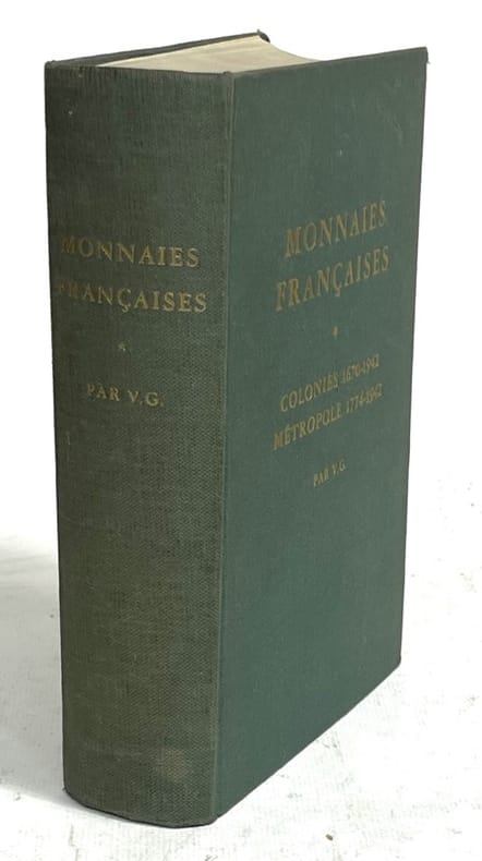 Sans nom Sans lieu ni date, vers 1970. Très fort In-12 pleine toile verte, 836 pages sur papier glacé. Réimpression de la très rare édition de 1942, référence sur le sujet. Contient la nomenclature de 5600 descriptions et indications de valeur de collection, illustrée de 3000 monnaies-types photographiées, de toutes les monnaies officielles et essais métalliques des : Colonies françaises des origines à nos jours : 1670-1942. Métropole, du Roi Louis XVI à nos jours. 1774 - 1942 y compris : Républiques, Royaumes, Souverainetés, Principautés, Sièges et occupations sous domination française. Très bon état.