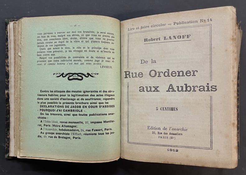 Contient : Socialisme ou Anarchie (Lorulot), éditions de l’Anarchie, 1910 ; Contre les Dogmes (Han Ryner), L’Idée Libre,1913 ; Les Criminels devant la Justice (Rédan), éditions du Groupe “Les Illégaux”, 1913 ; Procréation consciente (Lorulot), L’Idée Libre, 1913 - Le Mensonge électoral (Lorulot), L’Idée Libre, 1912 - La Procréation volontaire au point de vue individualiste, (Arnaud, E.), édition de l’Anarchie, 1912 - Le Culte de la Charogne (Libertad), édition de l’Anarchie, 1912 ; Réflexions sur l’Individualisme (Devaldès), édition de l’Anarchie, 1912 ; Hommes libres... Policiers et Magistrats (Levieux), éditions de “L’Effort” Groupe de propagande anarchiste, 1912 ; De la rue Ordener aux Aubrais (Lanoff), édition de l’Anarchie, 1912 ; Illégalisme et Légalisme (Ego), édition de l’Anarchie, 1912 - Pourquoi j’ai cambriolé (Jacob), éditions de l’Idée Libre, 1913 ; L’Apologie du crime (Mauricius), s.n.d.l. ; L’éducation rationnelle de l’enfance (Lamotte), s.n.d.l. ; Contre la guerre (Lorulot), s.n.d.l. ; Dieu n’existe pas (Elmassian), L’Idée Libre, s.d. ; La Préservation sexuelle (Marestan), Librairie International, s.d. ; Déclaration d’émile Henry, L’Idée Libre, s.d. ; L’Amour libre (Vernet), s.n.l.d. ; Cours d’hypnotisme et d’éducation de la volonté (Denis), L’Espérance, 1912 ; Ce que nous voulons, (Faure), L’Idée Libre, 1913 ; Le Droit à l’avortement (Pelletier), Librairie Internationale, s.d. Bon état d’occasion