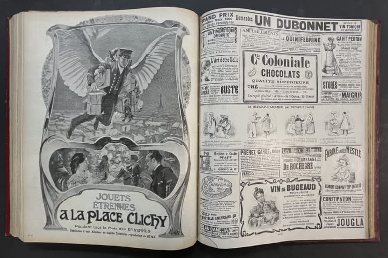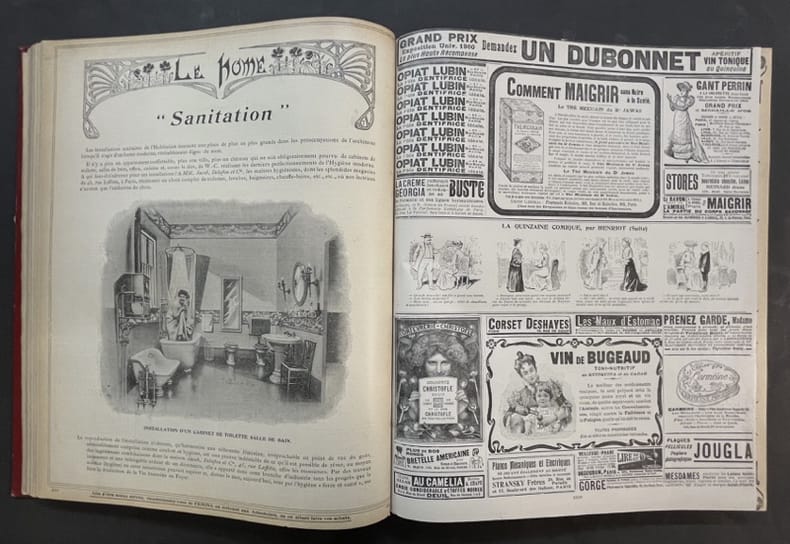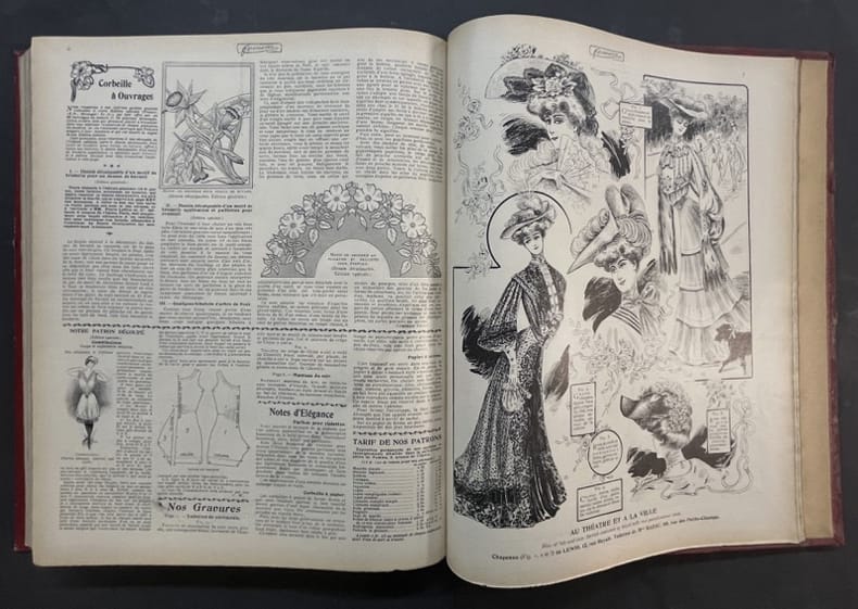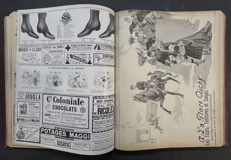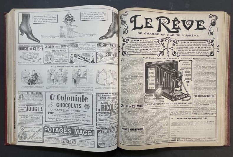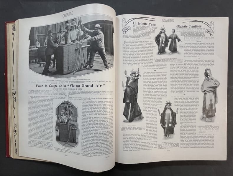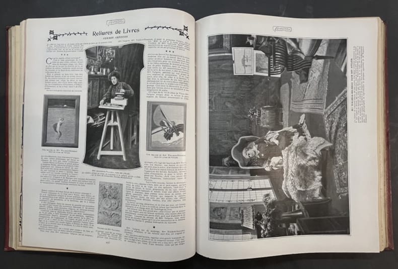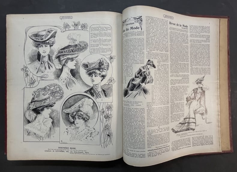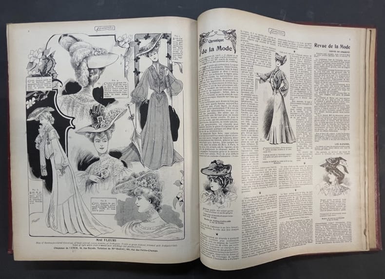 Paris, Pierre Lafitte 1903 2 volumes. In-folio 35,5 x 28 cm. Reliure demi-basane rouge, dos lisse orné de filets dorés, 772 pp. en pagination continue, nombreuses et belles publicités, dessins de créateurs de mode et nombreuses illustrations.