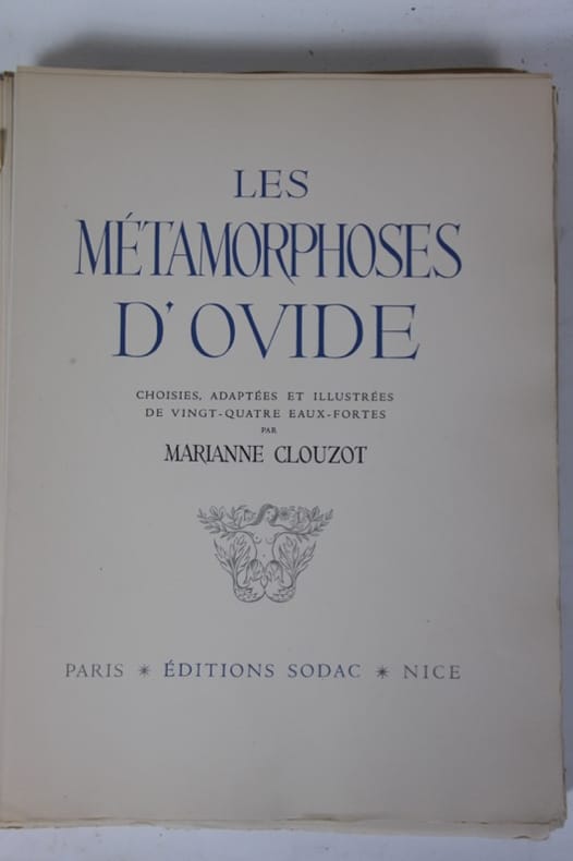 Editions Sodac, Nice, 1947, 1 volume de 28.5x38.5 cm environ, 213 pages, reliure demi chagrin à coins vert foncé, dos à 4 nerfs, avec titres dorés, tranche supérieure dorée. Exemplaire numéroté de 101 à 300 (N° 137), enrichi d'illustrations de 24 eaux-fortes de Marianne Clouzot et de 48 lettrines et culs-de-lampe gravés sur bois par G. Angiolini d'après les dessins de l'artiste. Infime frottement sur la coiffe supérieure, parfait état pour le reste.