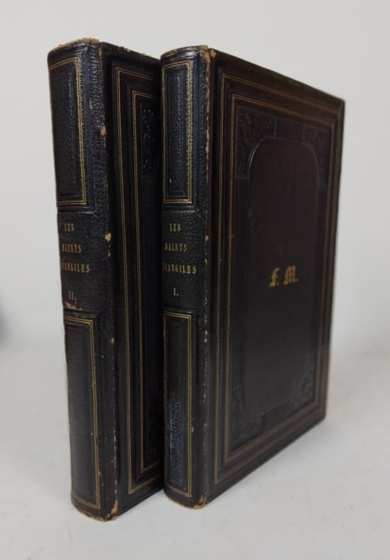 Frontispice en chromolithographie et en-tête et lettrine du discours préliminaire enluminés en couleurs, 12 hors-texte gravées sur acier et 10 hors-texte gravés sur bois par Tony Johannot, Cavelier, Gérard-Séguin et Brevière. Texte encadré d'une bordure gravée sur bois. Bien complet des 2 cartes en couleurs de la Palestine et de Jérusalem. Rousseurs éparses, mais bon exemplaire relié à l'époque: pleinchagrin noir, triple encadrement avec entrelas or sur les plats, fleuron et lettre or au dos lisse, tranches dorées, dentelle or en doublure. >COMPLET DES 2 TOMES. Très bon 0