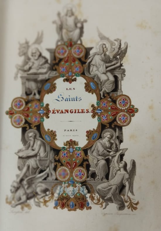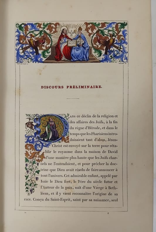 Frontispice en chromolithographie et en-tête et lettrine du discours préliminaire enluminés en couleurs, 12 hors-texte gravées sur acier et 10 hors-texte gravés sur bois, sur chine monté, par Tony Johannot, Cavelier, Gérard-Séguin et Brevière. Toutes sous serpente imprimée. Texte encadré d'une bordure gravée sur bois. Bien complet des 2 cartes en couleurs de la Palestine et de Jérusalem Bon état d’occasion