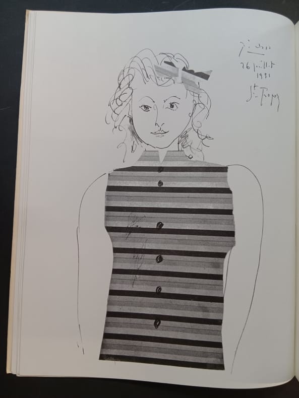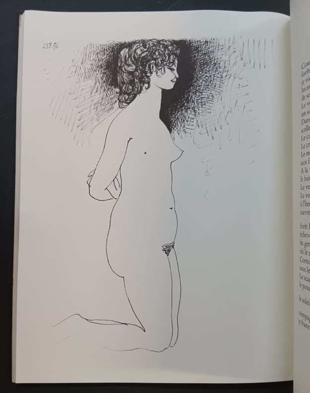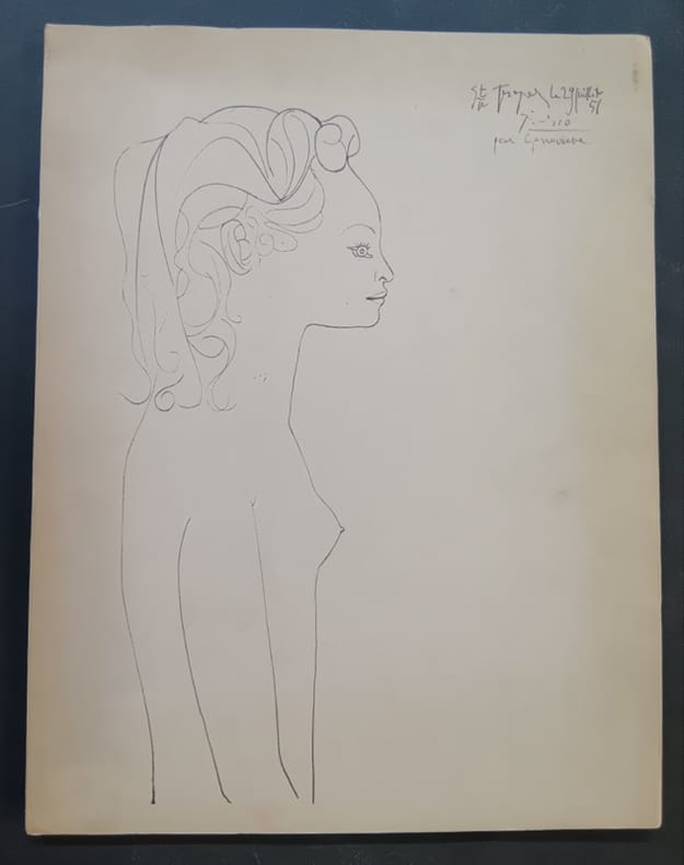 Plon / Galerie Françoise Tournié 1974 In-folio 37x28 cm, couverture rempliée, un dessin de Picasso au premier plat, catalogue, édité à l'occasion de l'exposition des dessins et gravures de Pablo Picasso présentés à la galerie Françoise Tournié, dessins illustrant les poèmes de Geneviève Laporte, petite déchirure au bas du dos intérieur frais sinon bon état d’occasion.